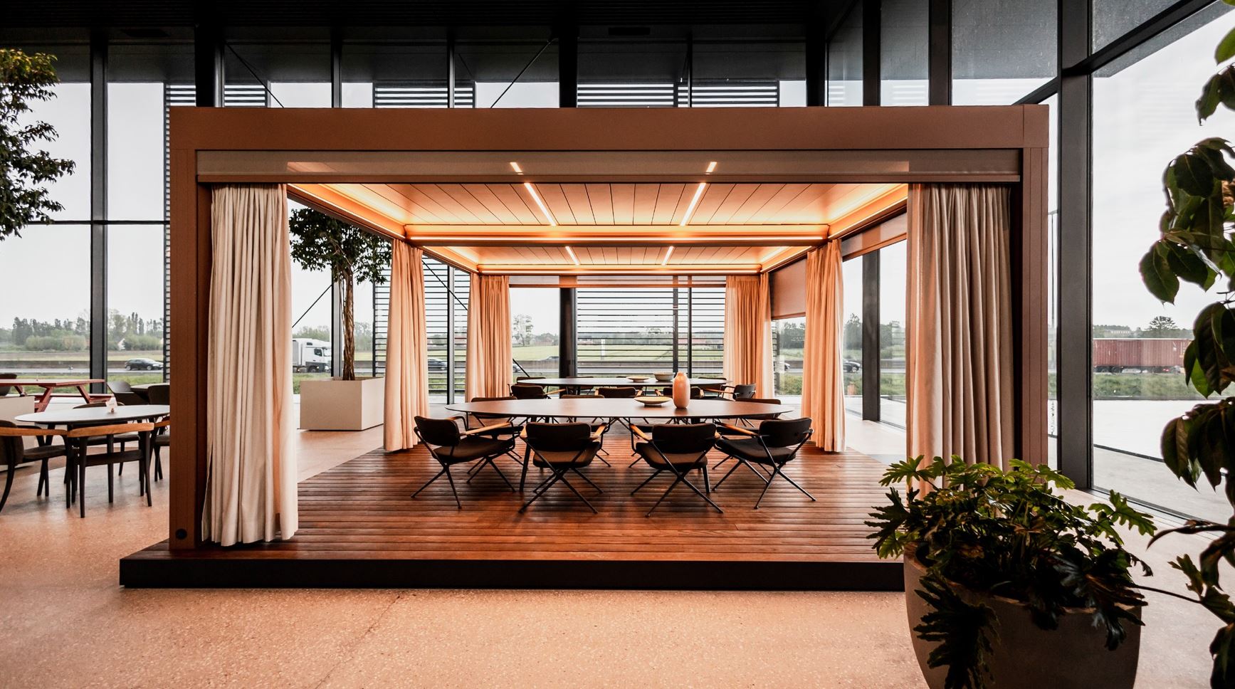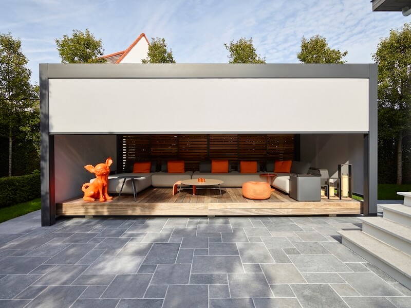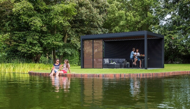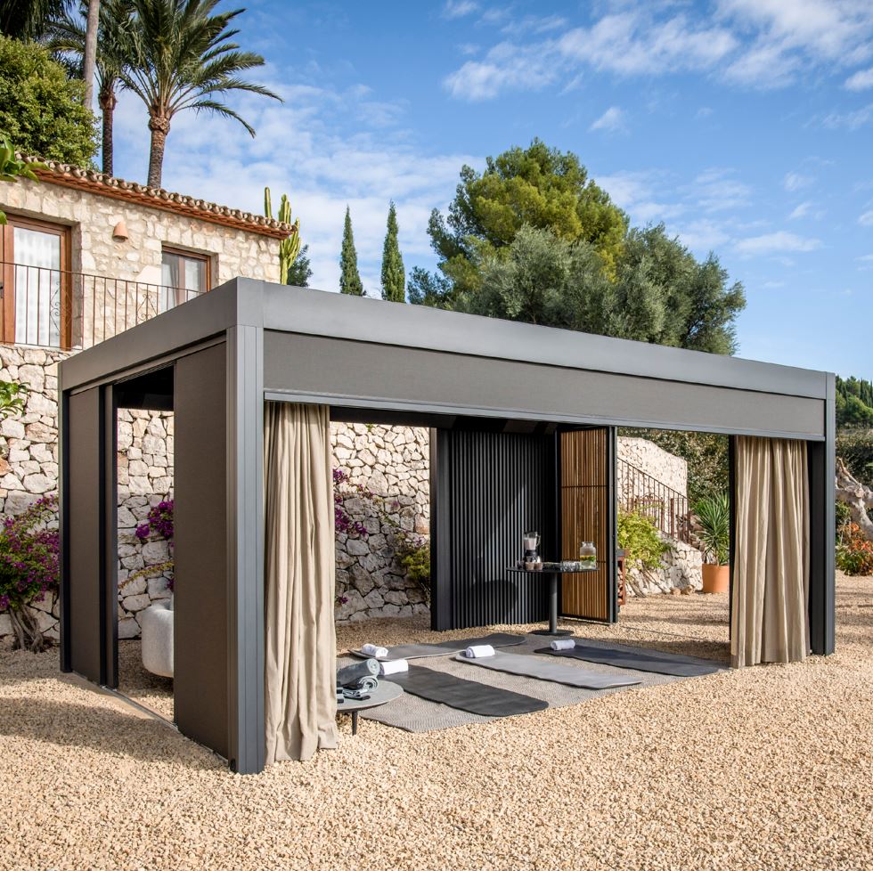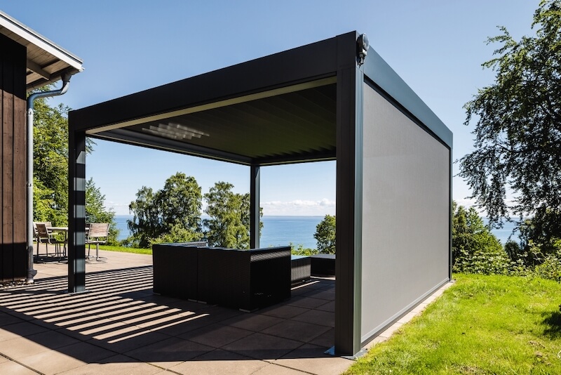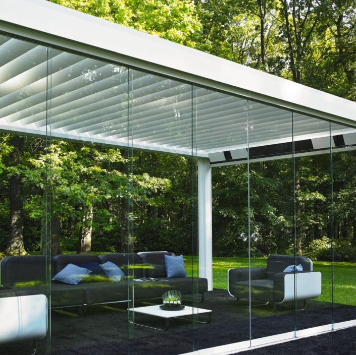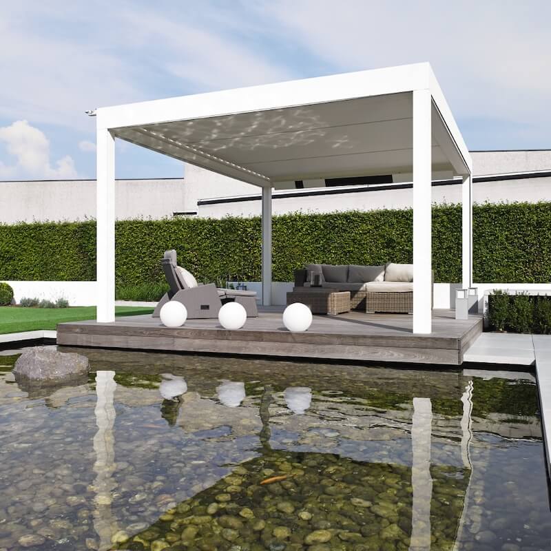 Pergola ir viedota no alumīnija un aprīkota ar rotējošām jumta lamelēm, kas ļauj jums kontrolēt gaismas daudzumu, ka arī pasargāties no saules un lietus.
