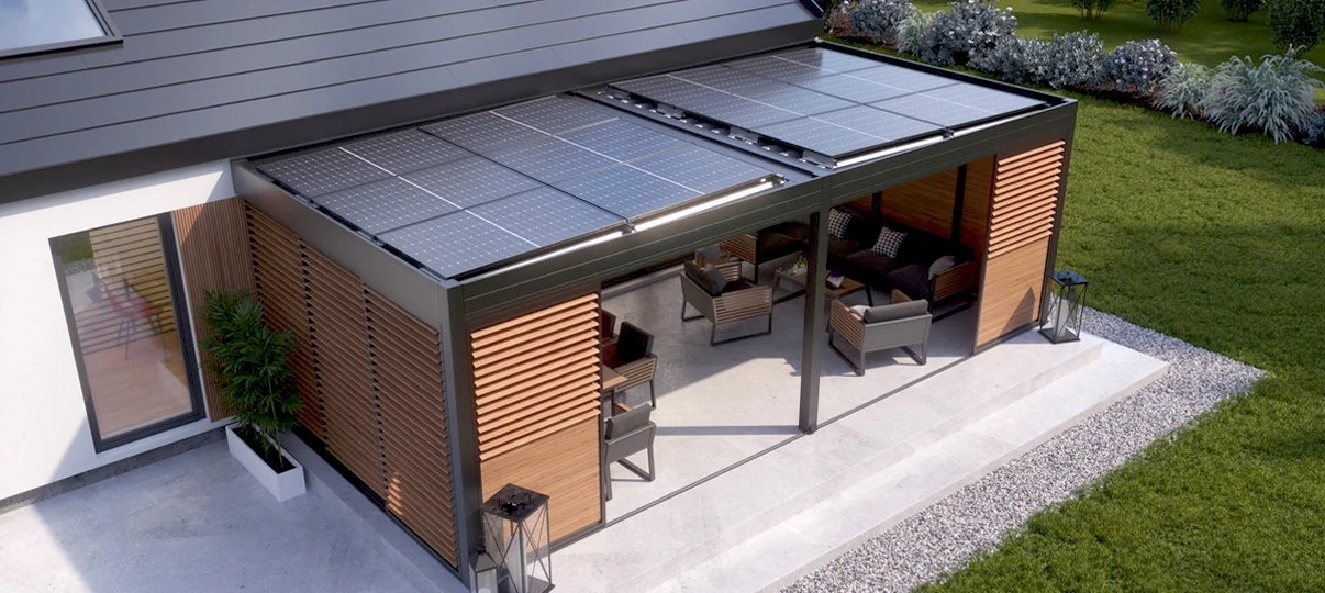 Nojume ne tikai aizsargā jūsu terasi, bet arī sniedz lielisku iespēju uzstādīt uz jumta saules paneļus un izmantot saražoto elektroenerģiju mājsaimniecībā. Iegādājoties kopā ar saules paneļiem, jūs varat pievienot arī 22 kW, 32 A, trīsfāzu jaudas līmeņa uzlādes staciju ar Demand Limitation Pro funkciju, kas ļauj uzlādēt ar maksimālo pieejamo jaudu, nepārsniedzot to.