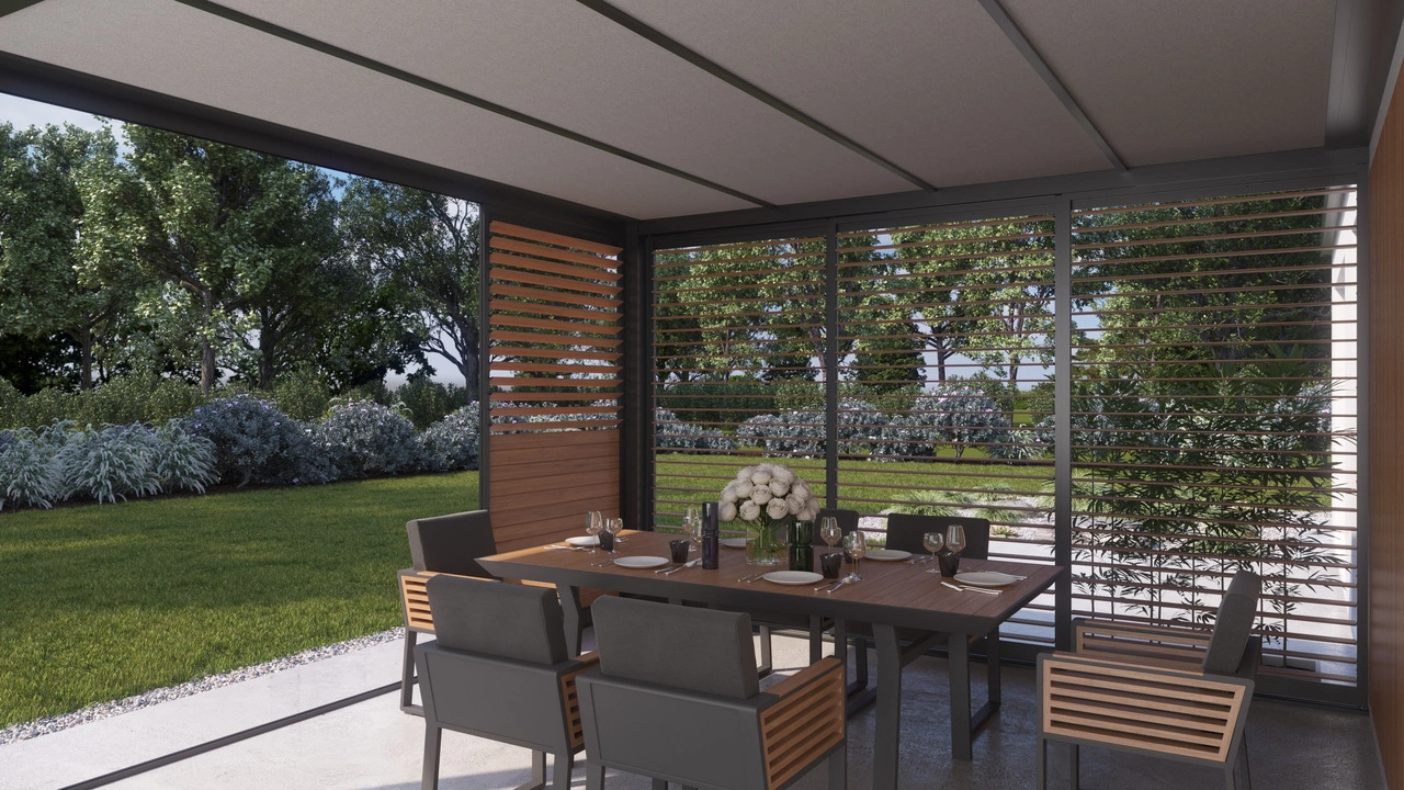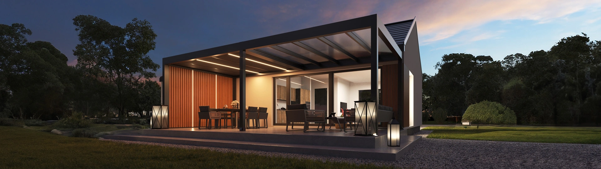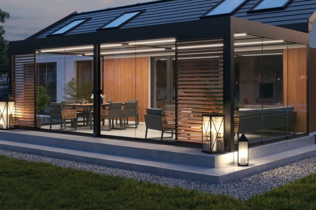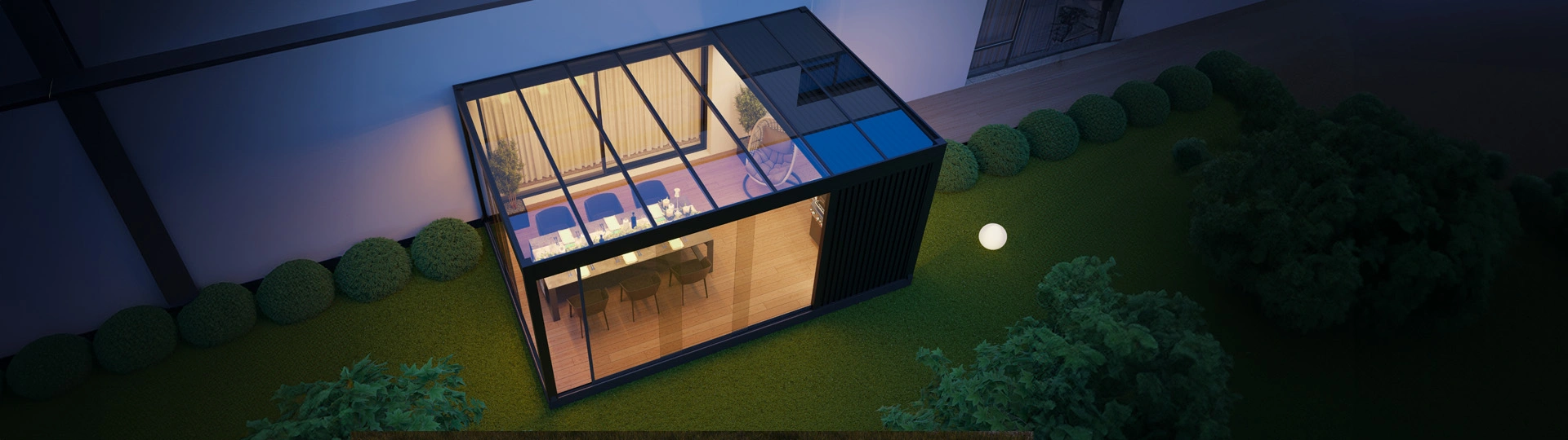 - Pieejams ar stikla, polikarbonāta, metāla vai saules paneļu jumtu