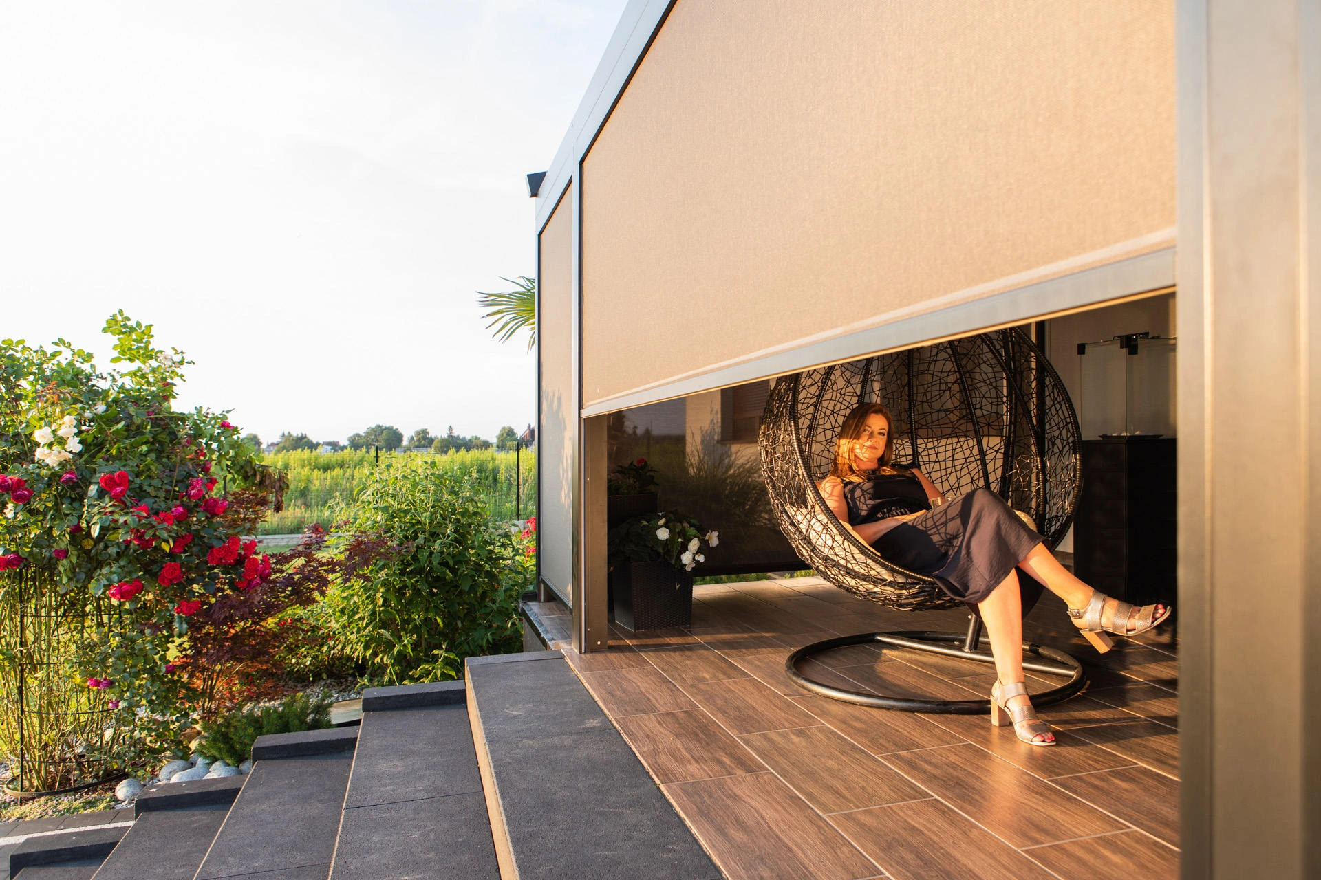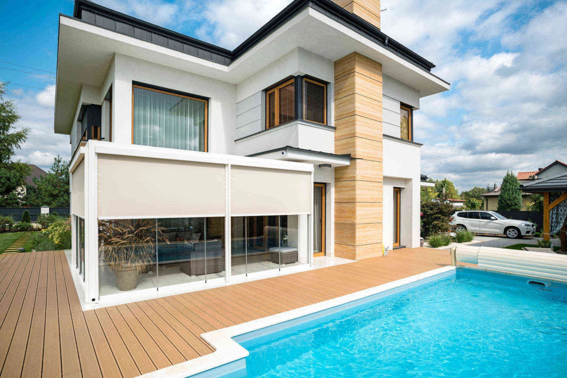 Ārējo žalūziju galvenais uzdevums ir aizsargāt terasi, kā arī ēku no pārmērīgas saules gaismas un sasilšanas.  Uzstādot uz lielām stiklotām virsmām, tie nodrošina optimālu aizsardzību pret saules gaismu. Žalūziju konstrukcija ir izgatavota no ekstrudēta alumīnija, kas ir pulverkrāsots jūsu izvēlētā krāsā no RAL krāsu paletes. Katram projektam individuāli tiek izvēlēts plašs sistēmu klāsts. Tas padara sistēmu par universālāko pārklājumu terases nojumju sāniem. Mēs piedāvājam plašu materiālu klāstu (iekļauts kristāla folija), kas ir pilnībā izturīgi pret skarbiem laikapstākļiem